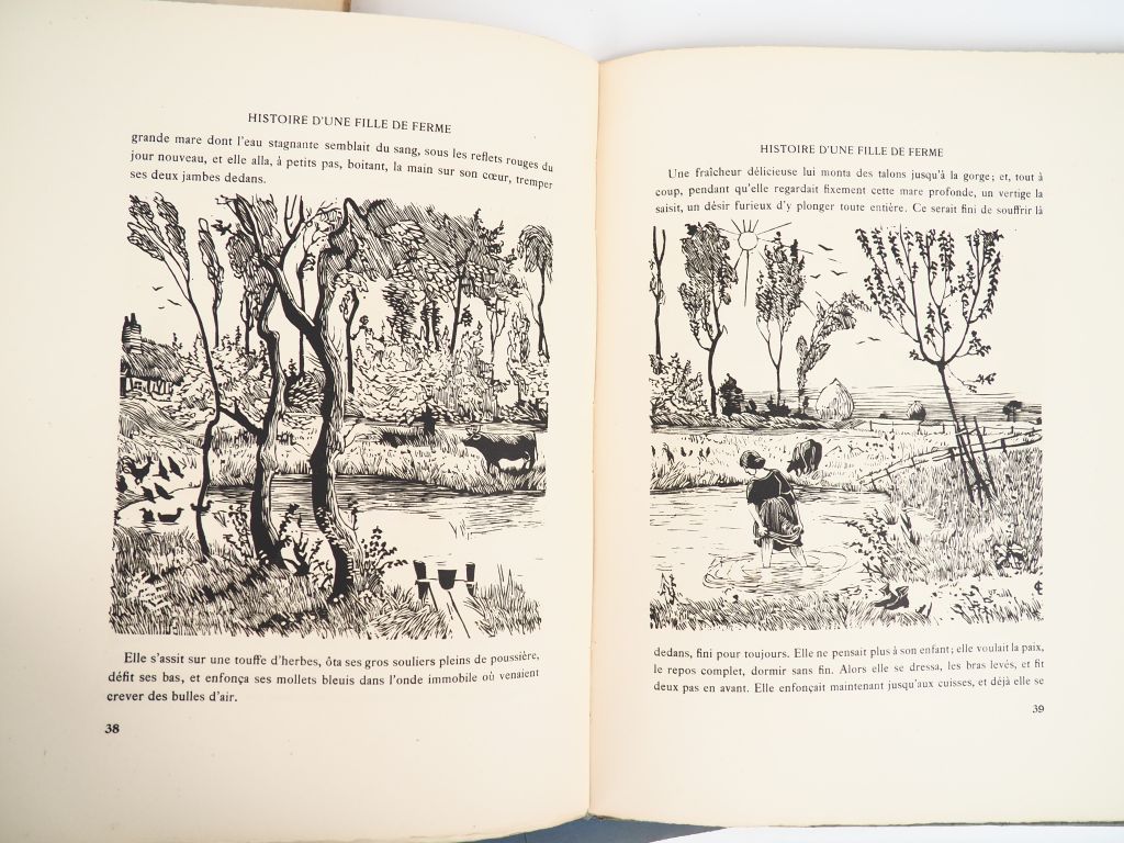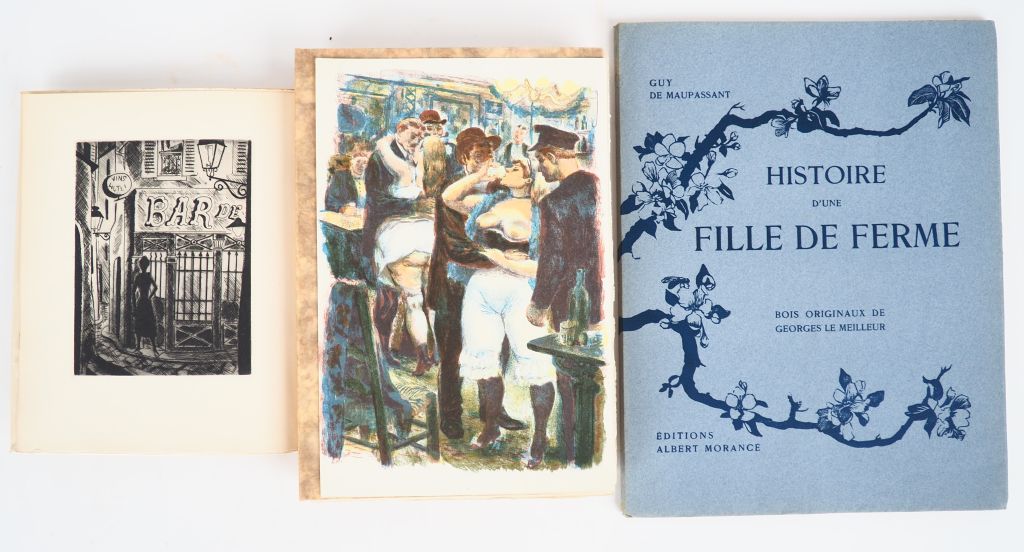 MAUPASSANT (Guy de.). LA MAISON TELLIER. Monaco, Les Documents d’Art, 1946. In-4 broché sous chemise et étui cartonné de l’éditeur. ÉDITION ILLUSTRÉE de 21 LITHOGRAPHIES originales en de BERTHOMMÉ SAINT ANDRÉ, dont 20 en couleurs (1 frontispice, 16 à pleine page et 3 dans le texte). Tirage limité à 900 exemplaires numérotés sur Pur Fil Johannot à la forme – MAUPASSANT (Guy de.). HISTOIRE D’UNE FILLE DE FERME. P., A. Morancé, 1923. Grand in-4 broché sous chemise papier à rabats un peu défraichie. ÉDITION ILLUSTRÉE de BOIS ORIGINAUX en noir de Georges LE MEILLEUR. Tirage limité à 252 exemplaires. UN des 210 numérotés sur Hollande van gelder – MAC ORLAN (P.). NUITS AUX BOUGES. P., Flammarion, 1929. In-4 broché. ÉDITION ORIGINALE ILLUSTRÉE de 6 EAUX-FORTES en noir de DIGNIMONT. Tirage limité à 890 exemplaires. UN des 750 numérotés sur vélin de Rives. ENSEMBLE DE 3 OUVRAGES.