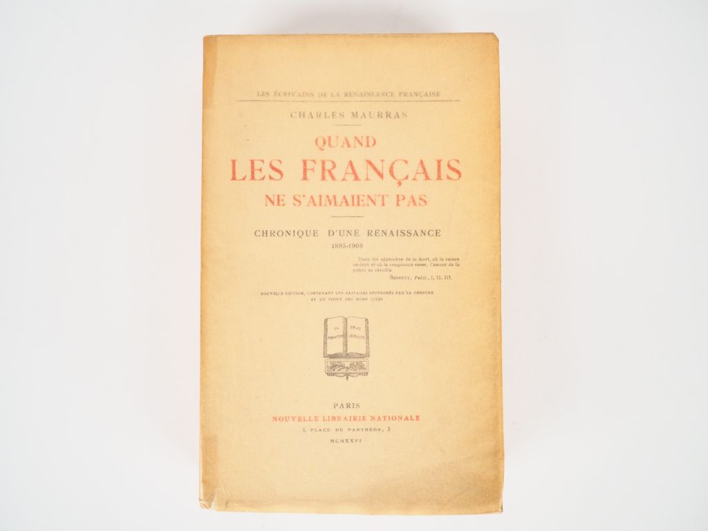 MAURRAS (Charles). Quand les Français ne s'aimaient pas. Chronique d'une renaissance (18958-1905). Paris, Nouvelles Librairie Nationale 1926. in-8, broché. Nouvelle édition contenant les passages supprimés par la censure. 1/100 ex. sur pur fil, nominatif