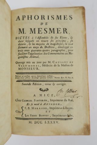 MESMER. Aphorismes de Mesmer, dictés à ses élèves, et dans lesquels on trouve ses principes, sa théorie et les moyens de magnétiser. Ouvrage mis au jour par CAULLET DE VEAUMOREL. A la suite : – Rapport des commissaires chargés par le Roi, de l'examen du Magnétisme animal. Nice, Gabriel Floteron 1785. 2 parties en 1 vol. in-12. Basane marbrée, dos orné (Rel. d'époque). Qqs lég. us. aux coiffes et aux coins.