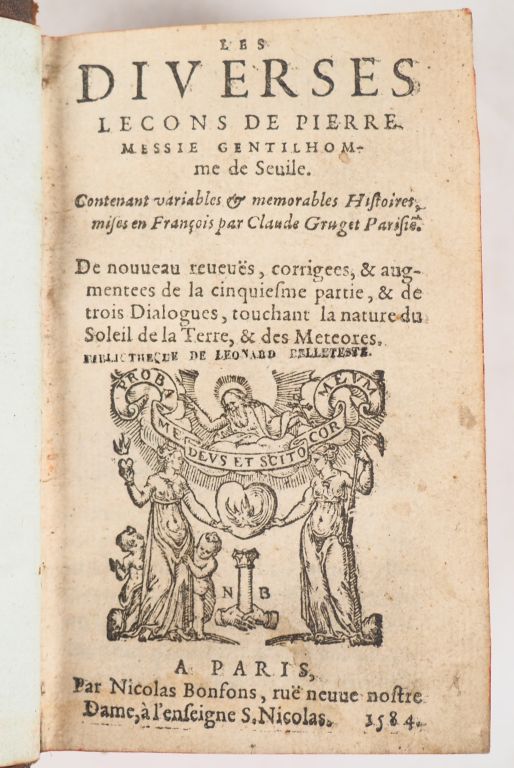 MESSIE (P.). LES DIVERSES LEÇONS DE PIERRE MESSIE Gentilhomme de Sevile [Séville]. Contenant variables et memorables Histoires, mises en François par Claude Gruget Parisien. P., Nicolas Bonsons, 1584. Fort volume in-16 basane brune, double encadrement de filet doré sur les plats, dos lisse cloisonné et orné, pièce de titre maroquin grenat, tranches rouges (Reliure ancienne) , (12) ff. dont titre, 616 ff.Marge de tête courte mais sans atteinte au texte NOUVELLE ÉDITION, revue, corrigée et augmentée de ce CURIEUX RECUEIL à vocation encyclopédiste, traitant à la fois de médecine, de gastronomie, mais aussi de l’origine de Mahomet, de l’empire des turcs, de diverses cérémonies en mariage, de guérisons merveilleuses, etc. Exemplaire en BEL ÉTAT, dans une reliure datant probablement du XVIIe. ¶ Caillet, III-91 – Dorbon, 3061, pour l’édition de 1554 (longue notice).