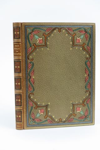 MIKHAËL (Ephraïm). Halyartès. Poème en prose. Imprimé pour la Société du Livre d'Art 1904. in-4. Maroquin vert bronze, fil. dor. et large encadr. Art nouveau mosaïqué, caissons dor. et mosaïqués au dos, cadre int. mosaïqué à l'identique, doublure de soie gris perle brodée de larges motifs floraux, tr. dor., étui bordé (Granghaud). Illustrations de Paul Gervais, gravées à l'eau-forte en couleurs par Xavier Maccard. Tirage limité à 100 ex. sur Arches de la Maison Périgot-Masure. 1/75 ex. nominatifs réservés aux membres de la Société, avec une double suite en noir des illustrations. Très bel exemplaire somptueusement relié. Le dos a viré.