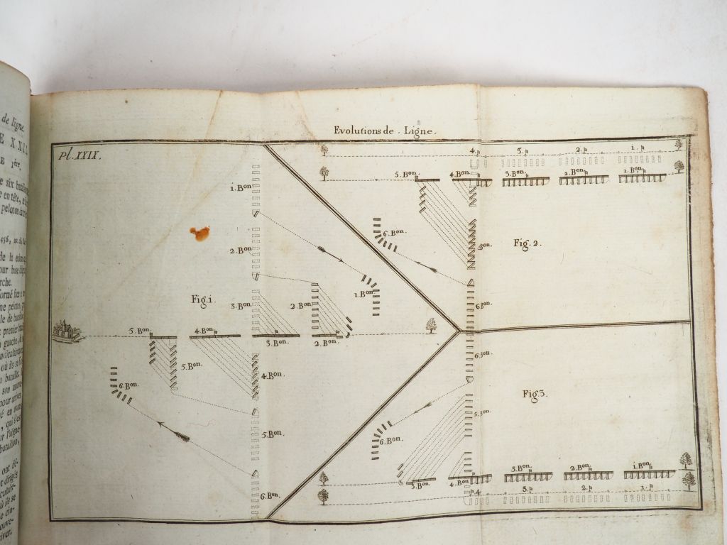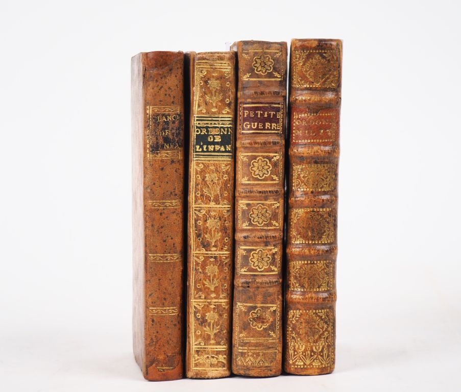[MILITARIA]. GRANDMAISON (Ph. Aug. Th. de). LA PETITE GUERRE, ou Traité du service des troupes légères en campagne. S.l.n.e., 1756. Deux parties reliées en un volume in-12 basane fauve marbrée, dos à nerfs orné, pièce de titre grenat, tranches rouges (Reliure de l’époque). Épidermures sur les plats, 1 coin émoussé. ÉDITION ORIGINALE de cet ouvrage fondateur qui expose la doctrine de « petite guerre », que l’on nomme aujourd’hui « guerre de harcèlement », « guerre non conventionnelle » ou bien encore « guérilla » – MICHEL (Major du Régiment d’infanterie de Rochefort). ORDONNANCES MILITAIRES DU ROY, réduites en pratique, et appliquées au détail du service. P., Mariette, 1714. In-12 veau fauve granité, dos à nerfs orné, tranches mouchetées en rouge (Reliure de l’époque). ÉDITION imprimée la 1ère fois en 1707 – ORDONNANCE DU ROI, pour régler l’exercice de ses troupes d’infanterie, du premier juin 1776. Lille, Peterinck-Cramé, 1776. In-12 basane fauve marbrée, dos lisse cloisonné et orné, pièce de titre vert lierre, tranches rouges (Reliure de l’époque). PREMIÈRE ÉDITION – PLANCHES RELATIVES AU RÈGLEMENT concernant l’exercice et les manœuvres de l’infanterie. Du premier août 1791. Lille, Deboubers, 1793. In-12 basane fauve granitée, dos lisse cloisonné de roulettes dorées, pièce de titre (Reliure de l’époque) , 95 pp., 40 pl. Coiffes et coins restaurés. PREMIÈRE ÉDITION. 40 PLANCHES, la plupart dépliantes. ENSEMBLE DE 4 OUVRAGES.