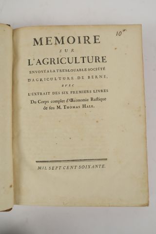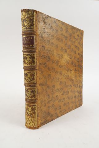 MIRABEAU (Victor-Riquetti, Marquis de). L'Ami des Hommes. Cinquième [et sixième] partie. Mémoire sur l'Agriculture, envoyé à la très louable Société d'Agriculture de Berne. S. l., s. n. 1760. in-4, VIII-167 pp.-1 f.-279 pp.-2 ff. Veau moucheté, dos orné (Rel. d'époque). Edition originale rare du dernier volume du livre fondamental de physiocratie. La sixième partie est consacrée à l'analyse du Tableau économique de Quesnay. Lég. us. coiffe sup.