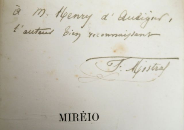 MISTRAL (Frédéric). Miréio. Pouémo prouvençau. (Avec la traduction française en regard). Avignon, Roumanille 1859. in-8, 515 pp. 1/2 veau aubergine, dos lisse, rinceaux et fil. dor., tête dor. (Rel. postérieure). Edition originale rare, enrichie d'un envoi a.s. à Henry d'Audiguier. Bel exemplaire finement relié. Dos passé.