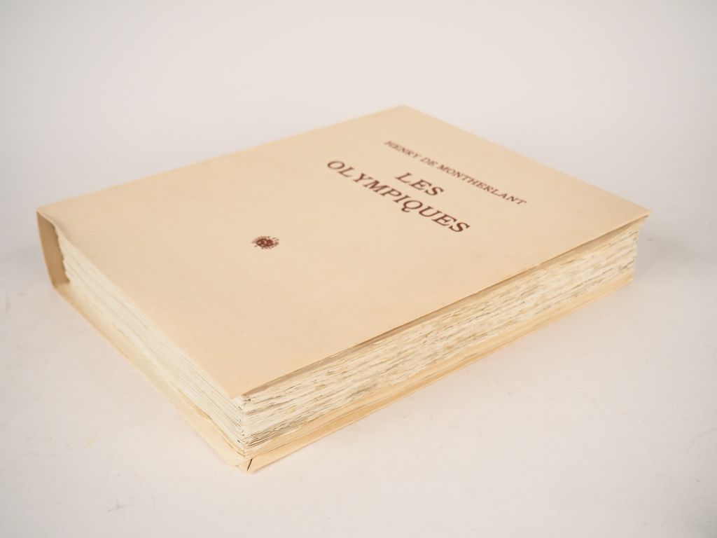 MONTHERLANT (Henry de). Les Olympiques. Burins de Eliane BEAUPUY. Paris, Sapienta 1947 in-folio en ff. Chemise et étui cartonné. Tirage : 270 ex. 1/22 vélin de rives contenant une suite des 22 burins et un cuivre encré et verni