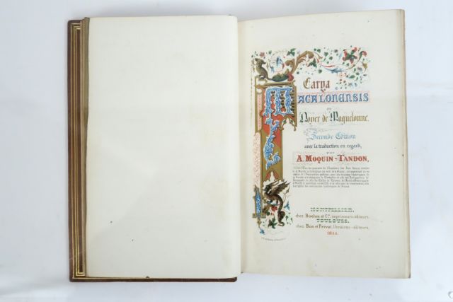 MOQUIN-TANDON (A.). Carya magalonensis, ou Noyer de Maguelonne. Seconde édition avec la traduction en regard. Montpellier, Boehm, Toulouse, Bon et Privat 1844. in-12, XXIV-1 f.-171 pp. Veau glacé, encadr. et prolongement des nerfs à froid, fil. int. dor., tête dor., couv. (Granghaud). Traduction d'un faux manuscrit occitan du XIVe s. à la gloire du gai savoir, découvert et publié par Moquin-Tandon en 1836. Belle édition ornée d'un frontispice, d'un titre enluminé et de lettrines en couleurs. Bel exemplaire.