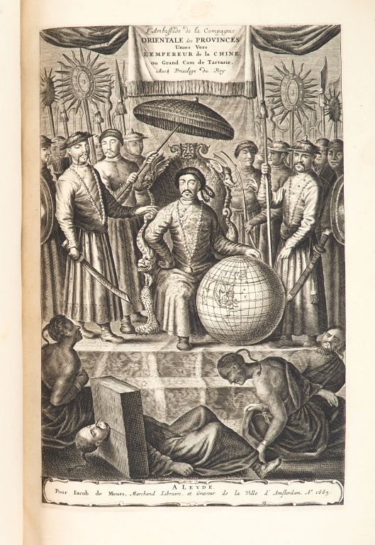 NIEUHOFF (Jean). L’AMBASSADE DE LA COMPAGNIE ORIENTALE DES PROVINCES UNIES VERS L’EMPEREUR DE LA CHINE, ou Grand Cam de Tartarie, faite par les Srs. Pierre de Goyer, Jacob de Keyser, illustrée d’une tres-exacte Description des Villes, Bourgs, Villages, Ports de Mers, autres Lieux plus considérables de la Chine. Leyde, Jacob de Meurs, 1665. 2 parties reliées en un volume in-folio veau brun, dos à nerfs orné, titre doré, tranches mouchetées en rouge (Reliure de l’époque) , frontispice, (7) ff., 288 pp., 31 pl. – 134 pp., 3 pl., (1) f. d’avertissement au relieur. Début de fente aux mors, coiffes manquantes, coins émoussés, infime travail de ver sans atteinte au texte en marge inférieure d’une quinzaine de ff. PREMIÈRE ÉDITION FRANÇAISE, traduite du hollandais par Jean Le Carpentier. IMPORTANTE ILLUSTRATION gravée en taille-douce, d’un beau tirage, très encré : TITRE-FRONTISPICE, 34 PLANCHES h-t. à double page, 110 COMPOSITIONS dans le texte, une vignette de titre, bandeau et lettrine. L’ouvrage a été relié SANS le portrait de J.-B. Colbert à qui l’ouvrage est dédié et SANS la carte de la Chine. Ex-libris héraldique d’un cardinal daté « 1724 », sous la forme d’un tampon rouge en marge du feuillet de titre. ¶ Cordier, Sinica, 2345 – Chadenat, I-140 : « Ouvrage rare ».