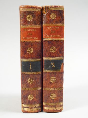 OEXMELIN (Alexandre Olivier). Histoire des Aventuriers Flibustiers qui se sont signalez dans les Indes, contenant ce qu'ils ont fait de remarquable depuis vingt années. Nouvelle édition. Paris, Le Febvre 1699. 2 vol. in-12. 1/2 basane, pces de titre rouges et vertes, pts fleur. dor. (Rel. début XIXe s.). Frontispice, 4 cartes, 1 plan et 3 figures dont 2 dépl. Mors fendus.