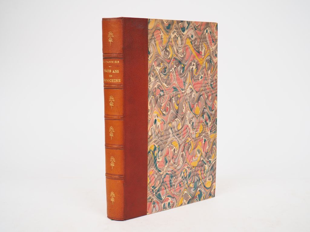 PANNIER (J.). TROIS ANS EN INDOCHINE. Notes de voyage. Toulouse, Société des Publications morales et religieuses, 1906. Grand in-8 ½ chagrin fauve, dos à nerfs orné, titre doré, tête dorée, plats de la couverture conservés (Reliure de l’époque). ÉDITION ORIGINALE. Nombreuses reproductions photographiques dans le texte.