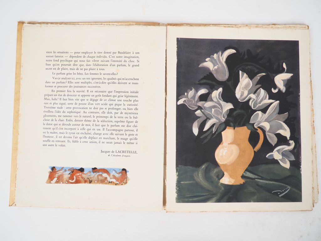 PARFUMS RAUCOUR. Imprimerie Kapp, 1945. Grand in-4 broché. Rousseurs plus marquées à la couverture et sur les premiers et derniers ff. ÉDITION ORIGINALE de cet ALBUM PUBLICITAIRE conçu et réalisé par Michel de Brunhoff pour les parfums RAUCOUR. Il contient 4 TEXTES de Paul Valéry Puissance des parfums, Jacques de Lacretelle Philosophie des parfums, Louise de Vilmorin Le choix d’un parfum et Colette Connaissance des parfums, respectivement illustrés en couleurs dans le texte et à pleine page par Henri MATISSE, André DERAIN, Christian BÉRARD et Kess VAN DONGEN. Tirage limité à 1000 exemplaires numérotés sur pur chiffon d’Auvergne.