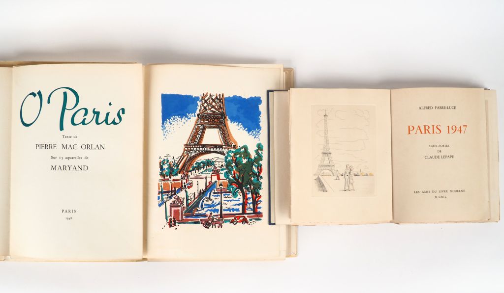 [PARIS]. MAC ORLAN (P.). O PARIS. P., 1948. In-folio en ff., chemise et étui. Pointes de rousseurs au 1er plat de la couverture. ÉDITION ORIGINALE ILLUSTRÉE de 15 AQUARELLES à pleine page de MARYAND. Tirage limité à 350 exemplaires numérotés sur vélin d’Arches, tous signés par l’artiste – FABRE-LUCE (A.). PARIS 1947. Les Amis du Livre Moderne, 1950. In-4 en ff., chemise et étui. ÉDITION ORIGINALE ILLUSTRÉE d’EAUX-FORTES en couleurs de Claude LEPAPE. Tirage limité à 130 exemplaires sur pur fil du Marais. UN des 120 nominatifs, celui-ci imprimé pour « M. Pierre Benoist ». ENSEMBLE DE 2 OUVRAGES.