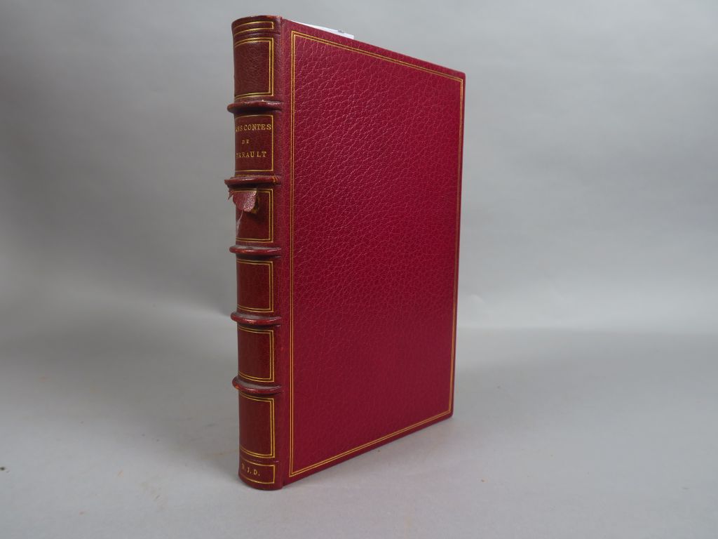 PERRAULT (Charles). Trois contes. La belle au bois dormant. Barbe bleue, Cendrillon. Dessins de Henry LEMARIE gravés sur bois et mis en couleurs. Paris, Jean Porson s.d. Plein maroquin bordeaux, caissons dor. au dos et double fil. dor. intérieur et sur les plats, doublure de tabis bleu (Raymond Jean). 45 illustrations dans le texte. 1/1500 sur vélin de rives. Accroc au dos de la reliure
