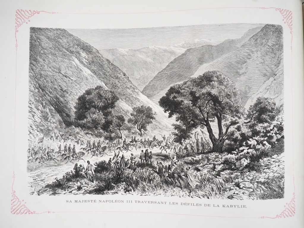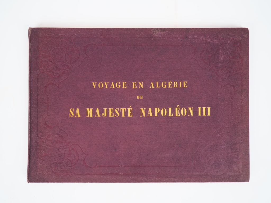 PHARAON (Florian). VOYAGE EN ALGÉRIE DE SA MAJESTÉ NAPOLÉON III. Paris, Plon, 1865. In-folio toile chagrinée marron de l’éditeur, décor à froid, titre doré au 1er plat, dos lisse muet , (3) ff., 96 pp., 12 pl. h.-t. ÉDITION ORIGINALE contenant 12 PLANCHES h.-t. et de nombreux dessins dans le texte par A. DARJOU. Exemplaire en BEL ÉTAT. ¶ Tailliart, 1740.