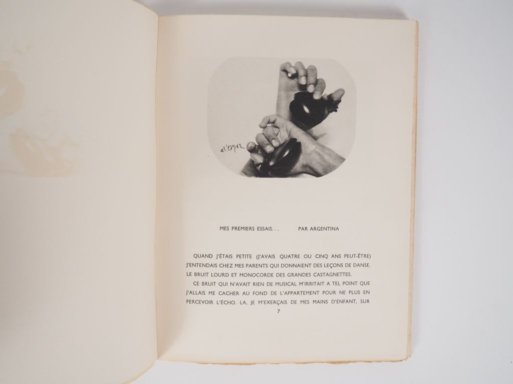 [PHOTOGRAPHIE]. ARGENTINA. P., Gilberte Cournand, 1956. In-4 broché, couverture rempliée, étui. ÉDITION ORIGINALE illustrée de 22 PHOTOGRAPHIES à mi-page en phototypie par Dora KALLMUS (1881-1963), plus connue sous le nom de Madame d’ORA et par Monique PARAVICINI (1916-2003) : elles représentent la danseuse et chorégraphe espagnole née à Buenos-Aires Antonia MERCÉ Y LUQUE (1890-1936). Tirage limité à 500 EXEMPLAIRES sur beau vélin d’Arches à la forme. Exemplaire nominatif, spécialement imprimé pour « Monsieur Jean MAYEUR ». Les textes insérés dans ce livre sont des extraits de presse parus entre 1928 et 1936.