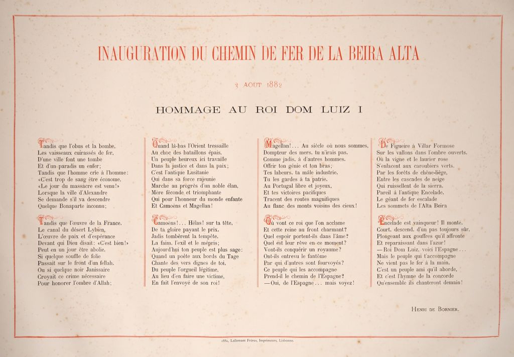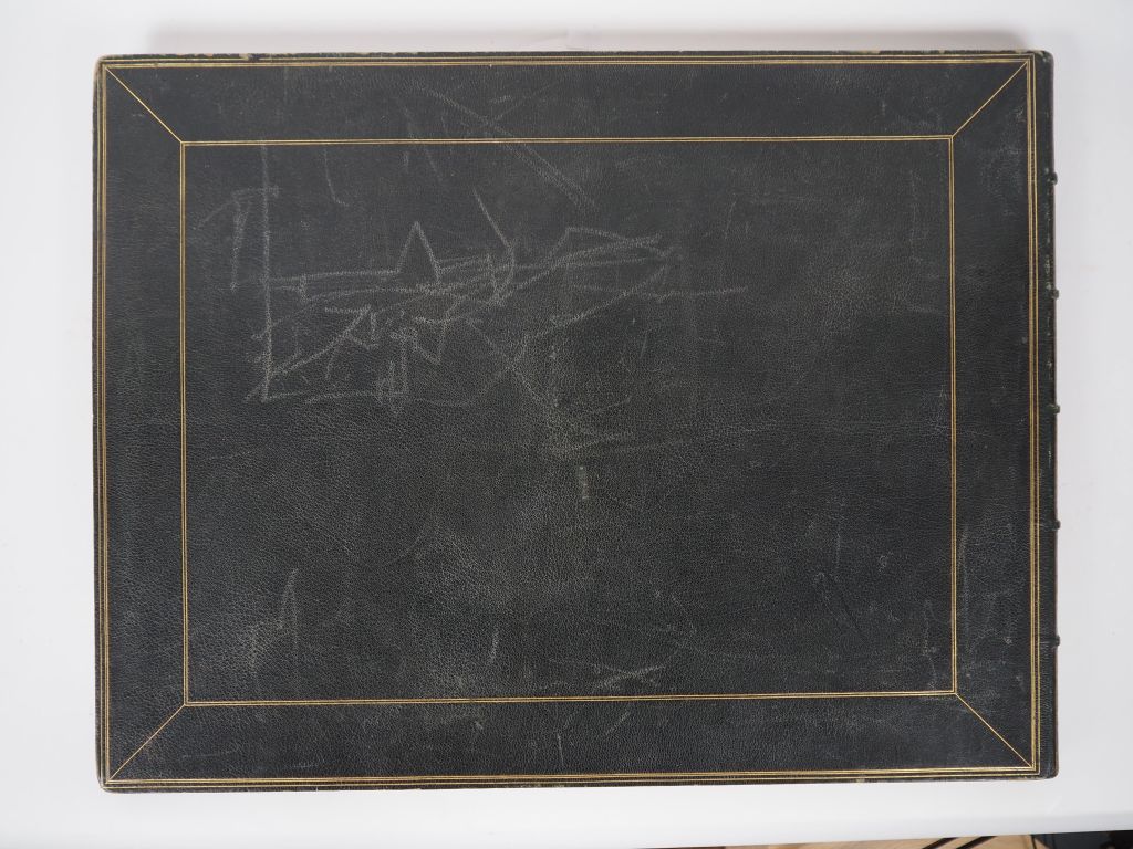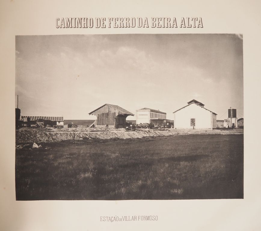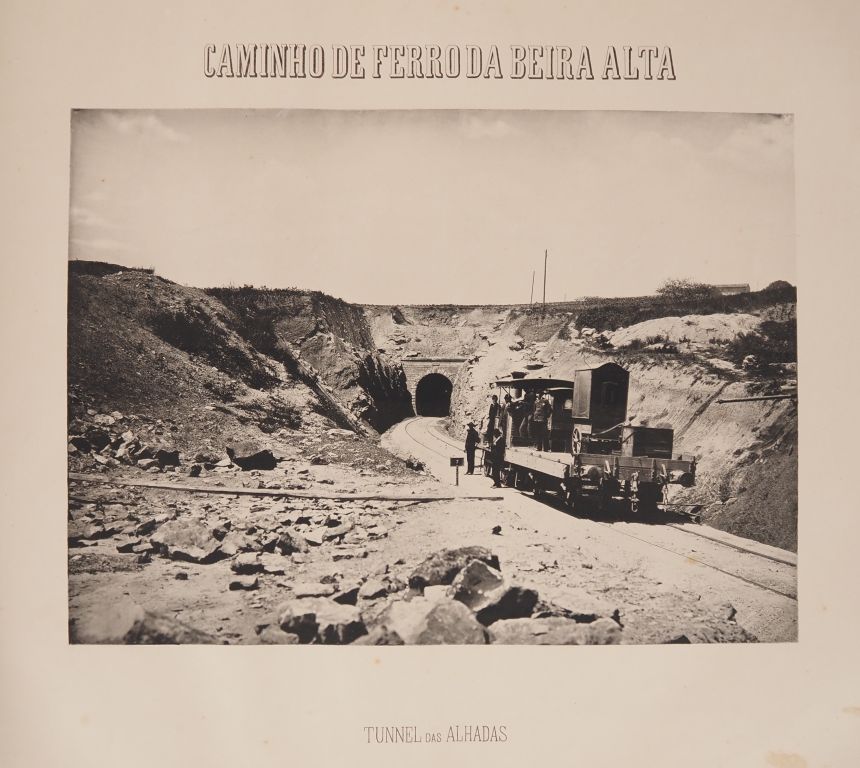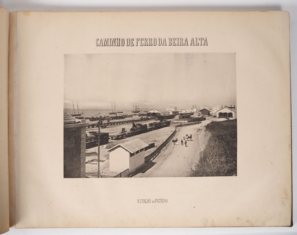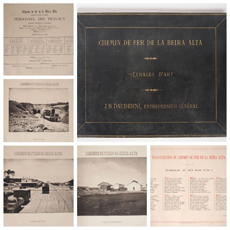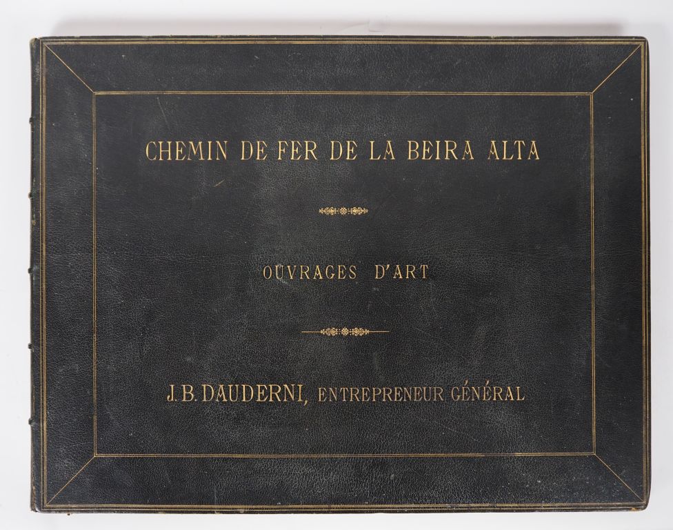 PHOTOGRAPHIE – CHEMINS DE FER. DAUDERNI (J. B.) « CHEMIN DE FER DE LA BEIRA ALTA – Ouvrages d’art » [CAMINHO DE FERRO DA BEIRA ALTA]. Lisbonne, Lallemant Frères, Imprimeurs, 1882. In-folio (63,5 X 48,5 cm environ) maroquin noir, plats ornés d’encadrements de filets et 2 fleurons dorés, titre doré au plat supérieur, dos à nerfs entièrement orné aux petits fers dorés, titre doré, coupes et coiffes filetées or, bordure intérieure ornée d’une large dentelle dorée, tranches dorées (Reliure de l’époque) , (1) f., 40 pl. sous serpentes, (1) f. Minimes taches claires en marge de quelques planches, petites traces d’usures et frottements à la reliure. RARE ET SPECTACULAIRE ALBUM CONSTITUÉ DE 40 PLANCHES DE REPRODUCTIONS DE PHOTOGRAPHIES en noir et blanc de grand format (38 X 27,5 cm environ), légendées en portugais, l’ensemble monté sur onglets. Un feuillet faisant office de titre détaille le personnel des travaux, le service sur la ligne et les entreprises générales ayant participé à la réalisation de la ligne. À la fin un poème d’hommage en français au roi Dom Luiz I, déclamé par Henri de Bornier à l’inauguration de la ligne du chemin de fer, le 3 août 1882. EXEMPLAIRE DE J. B. DAUDERNI, l’un des 3 entrepreneurs de la réalisation de la ligne de chemin de fer de la Beira Alta , il fut chargé de la réalisation de la ligne de la ville de Mangualde à la frontière espagnole (124 km). La ligne de chemin de fer BEIRA ALTA, considérée comme l’une des plus belles du Portugal, est longue de 202 kilomètres et relie la gare de Pampilhosa au bourg de Vilar Formoso, à la frontière espagnole. BEL EXEMPLAIRE, luxueusement relié. Expert : Eric Casteran