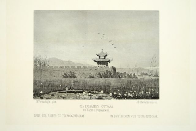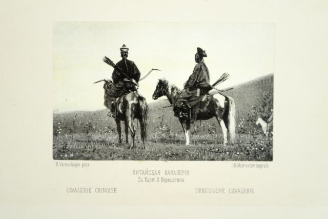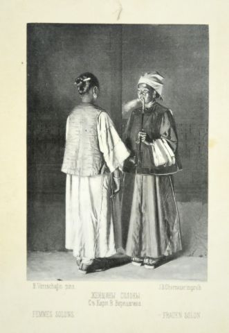 [Photographie]. VERESCHAGUINE (B.). Turkestan. Etudes d'après nature. 26 feuilles avec 106 sujets. St Petersbourg, chez A. Beggrow 1874. in-folio en ff. sous couverture imprimée et chemise à rabats de toile noire. Photographies contrecollées sur bristol. Légendes en russe, français et allemand. 22 planches sur 26 : 13 pl. à 2 sujets (10 x 14,5 cm), 8 planches à 9 sujets (10 x 6 cm) et 11 planches à 4 sujets (10 x 7 cm). Le tirage des photographies est très frais. Couverture déchirée avec manques.