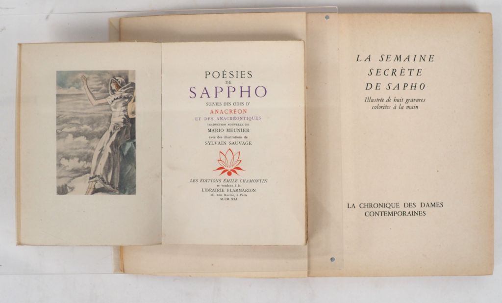 [PIA]. LA SEMAINE SECRÈTE DE SAPHO. Sans lieu, La Chronique des dames contemporaines, [vers 1930]. In-4 broché. ÉDITION ILLUSTRÉE de 8 COMPOSITIONS couleurs h.-t. d’André COLLOT, certaines libres. Tirage unique à 300 exemplaires numérotés sur vélin de luxe. Il s’agit d’une contrefaçon de l’édition publiée en 1929. L’auteur de cette imitation de La Semaine Secrète de Vénus est Pascal PIA. ¶ Dutel, 2385 – POÉSIES DE SAPPHO suivies des Odes d’Anacréon et des anacréontiques. Traduction nouvelle de Mario Meunier. P., Chamontin, 1941. ÉDITION ILLUSTRÉE de compositions couleurs h.-t. de Sylvain SAUVAGE. UN des 3100 numérotés sur vélin blanc Navarre. ENSEMBLE DE 2 OUVRAGES.