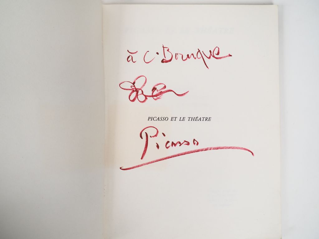 [PICASSO]. PICASSO ET LE THÉÂTRE. Exposition Musée des Augustins 22 juin – 15 septembre 1965. Toulouse, Musée des Augustins, été 1965. In-4 broché, couverture illustrée couleurs. ÉDITION ORIGINALE de ce catalogue illustré de reproductions en noir d’œuvres de Picasso. ENVOI AUTOGRAPHE SIGNÉ agrémenté sur le feuillet de faux-titre d’un PETIT DESSIN ORIGINAL au feutre rouge de PICASSO : « à C.[onstant] Baruque / Picasso ». Constant BARUQUE (1914-1969) est un peintre français d’origine espagnole qui vécut à Limoux (Aude).