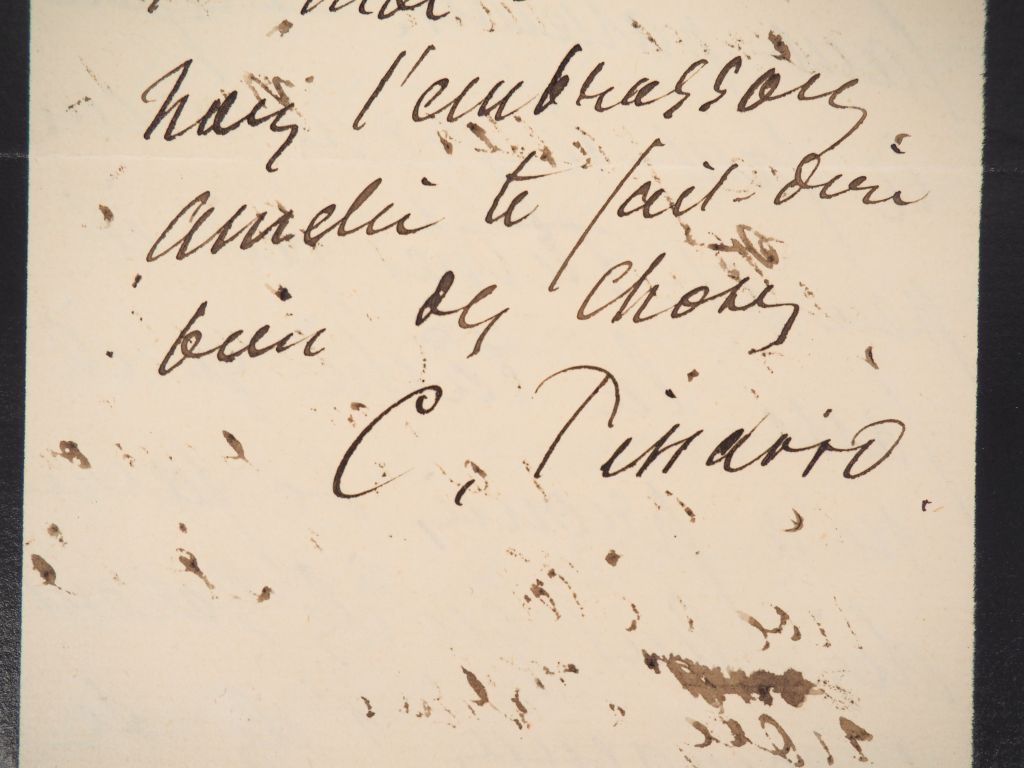 PISSARRO (Camille). LETTRE AUTOGRAPHE SIGNÉE adressée à sa femme Julie. Paris, 18 mai 1890. 4 pages in-12 sur un feuillet double de papier de deuil. BELLE LETTRE qui laisse entrevoir l’intimité de la famille Pissaro et permet de se rendre compte à quel point le peintre prenait son rôle de père au sérieux. Camille PISSARO s’apprête à partir pour Londres avec son fils Lucien. Il évoque ensuite un autre de ses fils, Félix, surnommé « Titi » : « Ce que tu me dis de Titi est fort ennuyeux, mais je crois qu’il est encore bien enfant pour penser sérieusement, il aime à jouer, il faut être un peu patient pour ne pas gâter l’avenir. N’avons-nous pas tous été la même chose. Si il ne fait pas plus de mal que de jouer, il faut patienter. - Cependant il faut le gronder un peu et tâcher qu’il fasse la tâche qu’il m’a promis de faire. Dis-leur qu’ils seront récompensés s’ils se conduisent bien. Je n’ai rien de plus à ajouter. »