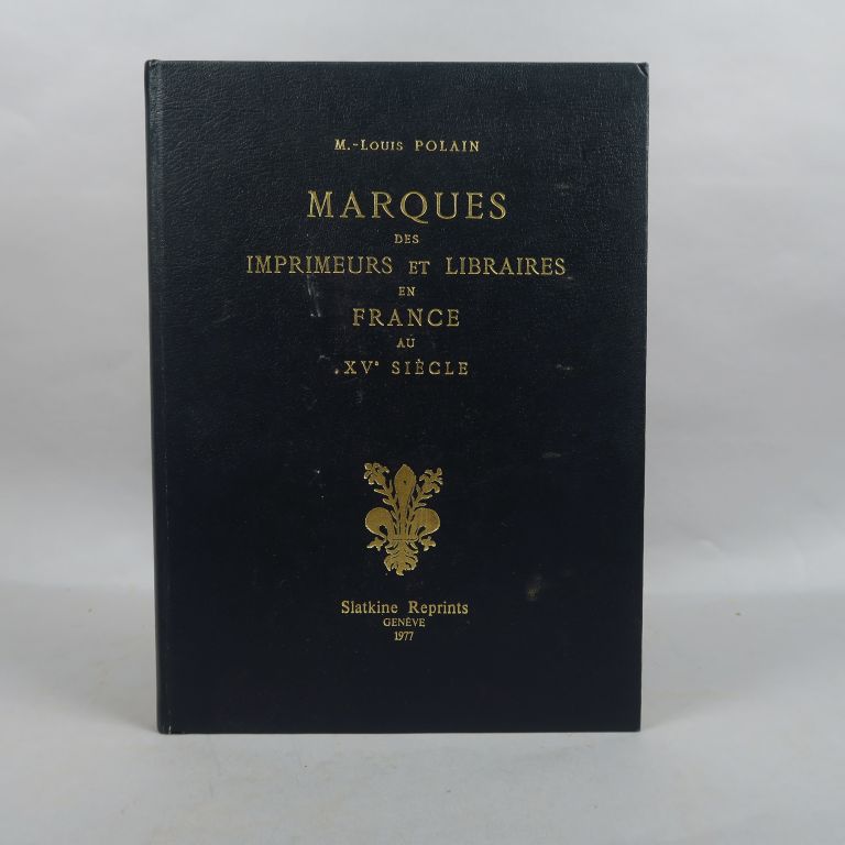 POLAIN (M.-Louis). Marques des Imprimeurs et Libraires en France au XVe siècle. Genève, Slatkine Reprints 1977. in-4, 207 pp. in-4. Reliure éditeur skivertex vert. Joint : – MAZIERES MAULEON (baron Lucien de). Marques héraldiques et devises des Imprimeurs et libraires normands du XVe au XVIIIe siècle. Paris, Bibliothèque de la "Revue héraldique" 1905. Plaquette in-8, br. 19 pp.
