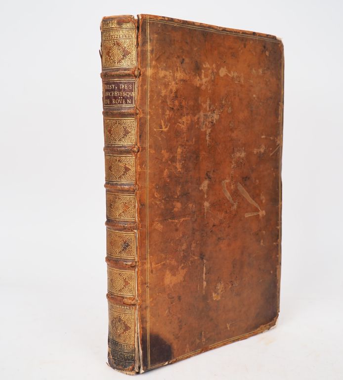 POMMERAYE (Dom J.-Fr.). HISTOIRE DES ARCHEVESQUES DE ROUEN. Rouen, Maurry, 1667. In-folio veau blond glacé, encadrement de double filet doré sur les plats, dos à nerfs très orné, pièce de titre maroquin grenat, tranches mouchetées en rouge (Reliure de l'époque) , (6) ff., 680 pp., (4) ff. de table. Mors fendus mais coutures solides, coiffes manquantes, tache sombre en pied de la reliure, coins très émoussés, manques aux coupes. ÉDITION ORIGINALE de cet ouvrage peu commun, au beau format in-folio. SANS le portrait de l’archevêque Fr. de Harlay de Chanvalon qui manque souvent. BON EXEMPLAIRE, à belles marges. ¶ Brunet, IV-794 : « Ouvrage estimé ».