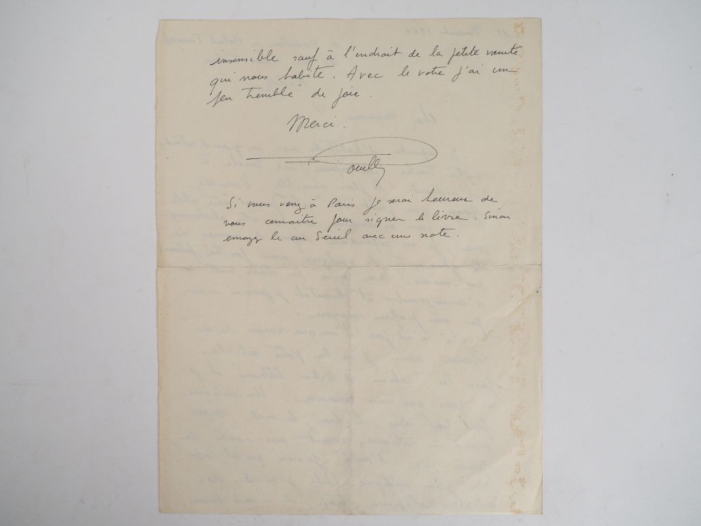 POUILLON (Fernand) (1912-1986). LETTRE AUTOGRAPHE SIGNÉE. [Paris], 15 novembre 1964. Une page et ½ sur f. (21 X 27 cm). LETTRE DE REMERCIEMENT DE L’ARCHITECTE À UN CRITIQUE : « J'ai lu votre article pour les Cahiers d'Action littéraire […] un critique peut tout dire, le bien, le mal. Mais quand un critique ressent avec acuité la pensée de "l'autre", je crois qu'il est un bon critique... ». Pouillon ajoute : « Certes j’ai eu des articles élogieux, trop, ils m’ont laissé insensible sauf à l’endroit de la petite vanité qui nous habite. Avec le vôtre j’ai un peu tremblé de joie. Merci. F. Pouillon ».