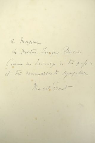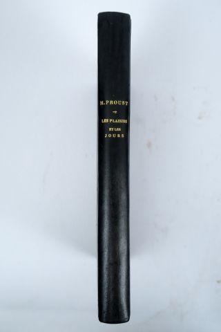 PROUST (Marcel). Les Plaisirs et les Jours. Illustrations de Madeleine LEMAIRE. Préface d'Anatole France et quatre pièces pour piano de Reynaldo Hahn. Paris, Calmann Levy 1896. in-4, X-273 pp. Bradel 1/2 basane aubergine, tête dor., couv. cons. (Rel. d'époque). Edition originale du premier livre de Proust enrichi d'un envoi a.s. au Dr François Boissier : « comme un hommage de très profonde et très reconnaissante sympathie ». Petites piqûres au plat sup. de la couverture.