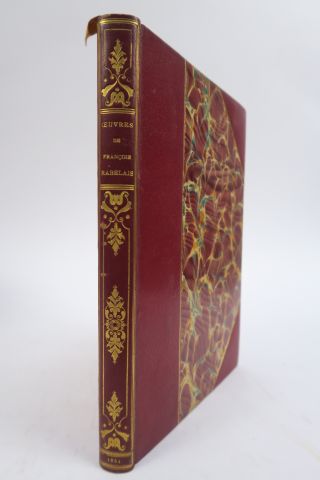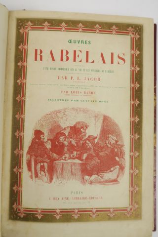 RABELAIS. Œuvres précédées d'une notice historique sur la vie et les ouvrages de Rabelais par P.-L. Jacob. Illustrée par Gustave DORÉ. Paris, J. Bry 1854. gd in-8. 1/2 maroquin rouge à coins, dos long orné d'un décor rocaille dor., couv. et dos cons. (Champs-Stroobants). Premier tirage des superbes illustrations de Gustave Doré, gravées sur bois dans le texte et hors-texte. Texte sur 2 colonnes. Bel exemplaire, finement relié, avec ses belles couvertures illustrées en 2 couleurs dans un encadrement doré, conservées.