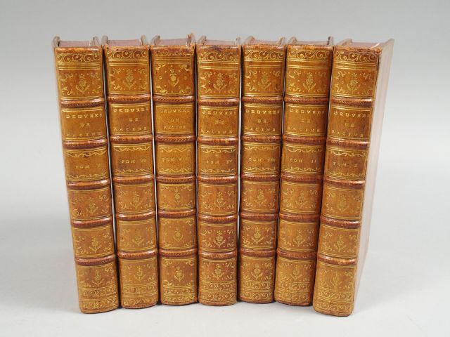RACINE (Jean). Œuvres, avec des commentaires par M. Luneau de Boisjermain. Paris, Impr. de Louis Cellot et Londres, s.n. 1768. 7 vol. in-8. Veau blond glacé, triple fil. d'encadr. dor. sur les plats, dos orné (Rel. d'époque). Portrait et 10 figures hors-texte de Gravelot. Bel exemplaire.