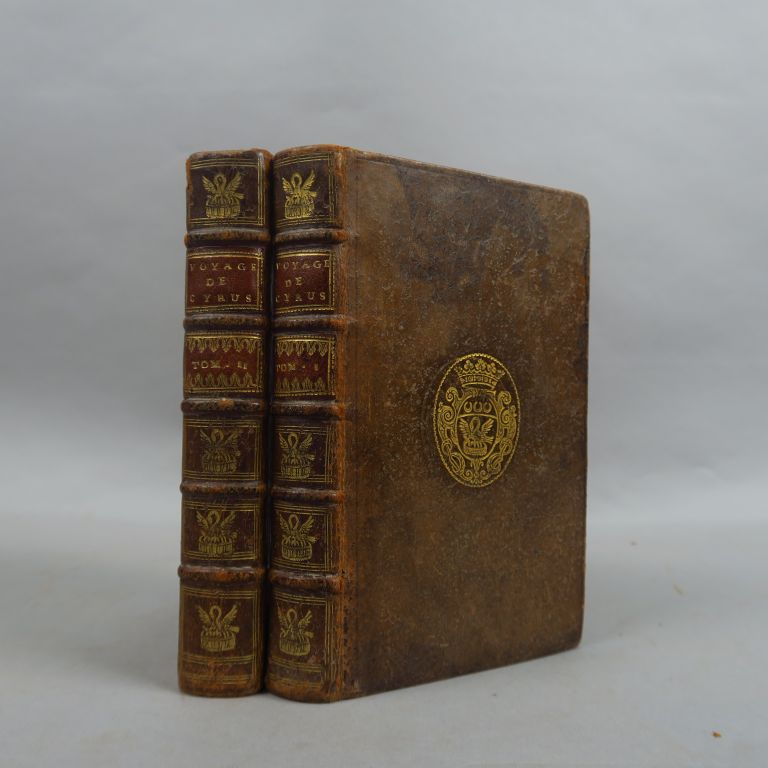 RAMSAY. Les voyages de Cyrus, avec un discours sur la Mythologie. Paris, G. F. Quillau 1727. 2 vol. in-12. Veau, dos ornés, armoiries (Rel. de l’époque). Première édition de cette utopie destinée, au travers de voyages, à l’éducation d’un despote éclairé. Frontispice. Reliure aux armes de Chaspoux marquis de Verneuil.