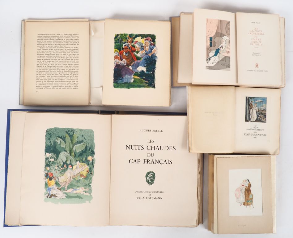 REBELL (H.). LES NUITS CHAUDES DU CAP FRANÇAIS. P., Aux dépens d’un amateur, 1936. Grand in-4 en ff., chemise et étui de l’éditeur. Dos de la chemise passé et taché, mors fendus. ÉDITION ILLUSTRÉE de 34 POINTES-SÈCHES originales couleurs de Ch.-A. EDELMANN. Tirage limité à 300 exemplaires. UN des 175 numérotés sur pur chiffon de Lana – REBELL (H.). LES NUITS CHAUDES DU CAP FRANÇAIS. P., Jonquières, 1927. In-8 broché. ÉDITION ILLUSTRÉE de 20 POINTES-SÈCHES originales couleurs de Hermine DAVID. UN des 1050 exemplaires numérotés sur Rives – PILLET (Roger). LES ORAISONS AMOUREUSES DE JEANNE AURÉLIE GRIVOLIN LYONNAISE. P., Éd. du Moustié, 1948. In-8 en ff., chemise et étui. ÉDITION ILLUSTRÉE de COMPOSITIONS en couleurs d’ESPÉRANCE. Tirage limité à 843 exemplaires. UN des 150 numérotés sur Marais pur fil contenant une SUITE en noir et 4 PLANCHES refusées – LES ÉGAREMENS DE JULIE. P., Eryx, 1949. In-4 en ff., chemise (manque l’étui). ÉDITION ILLUSTRÉE de 21 AQUARELLES de SAINTE-CROIX. Tirage limité à 685 exemplaires. UN des 195 numérotés sur vélin de Renage contenant 3 SUITES en noir (une de toutes les illustrations, une hors-commerce de 8 dessins avec remarques et une de 4 dessins refusés) – DIDEROT (D). LA RELIGIEUSE. P., Éd. Arc-en-Ciel, 1943. In-4 broché, étui carton. ÉDITION ILLUSTRÉE de COMPOSITIONS en couleurs de Victor LHUER. Tirage limité à 2000 exemplaires. UN des 30 premiers numérotés sur vélin contenant 2 SUITES (1 en couleurs et une autre monochrome) ainsi qu’une AQUARELLE ORIGINALE sous passe. ENSEMBLE DE 5 OUVRAGES.
