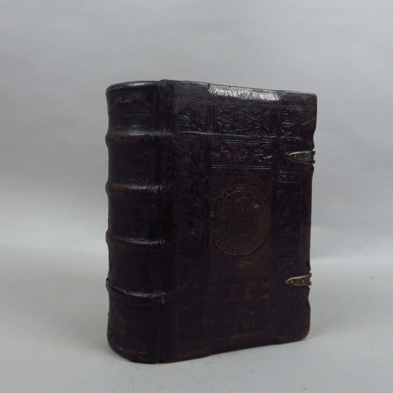 [Reliure gothique]. LANSPERGIUS (Joannis Justi, carthusiani). Epistolas et Evangelia, quae in Festivitatibus Sanctorum in Ecclesiis recutantur... Tomus tertius. Antverpiae, J. Stelsius 1570. in-8. Veau brun sur ais de bois, décor gothique estampé à froid sur les plats, fermoirs (Rel. de l’époque). Intéressante reliure gothique qui a fait l’objet de l’étude suivante, notée sur un bristol : « En raison de l’état défectueux de cette reliure, l’étude du décor ne permet pas de l’attribuer à un atelier. Toutefois l’emploi de la rosette et du gland, et aussi certains éléments de la roulette d’encadrement permettent une comparaison avec les fers employés, à la même époque, par Gallus DINGENAUER, à Innsbrück. La reliure porte la date de 1574. Dingenauer a travaillé de 1573 à sa mort en 1588. Malheureusement nous ne pouvons lire les initiales G. D., signature authentique de Meister G-D. (cf. étude de Walter Neuhauser in de libris compactis miscelanea, Bruxelles 1984) ».