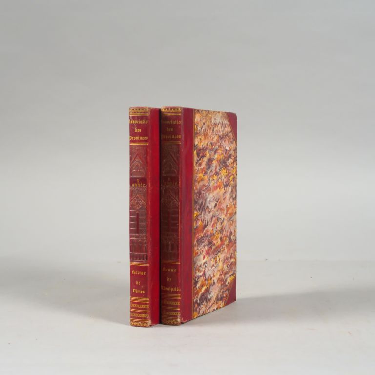 REVUE DE NIMES-REVUE DE MONTPELLIER 1ère année. Association intellectuelle des Provinces, Bibliothèque Méridionale. Montpellier, Impr. Vve Avignon 1836. 2 vol. in-8. 1/2 chagrin rouge à coins, décor cathédrale à froid (Rel. d'époque) Qqs cahiers brunis