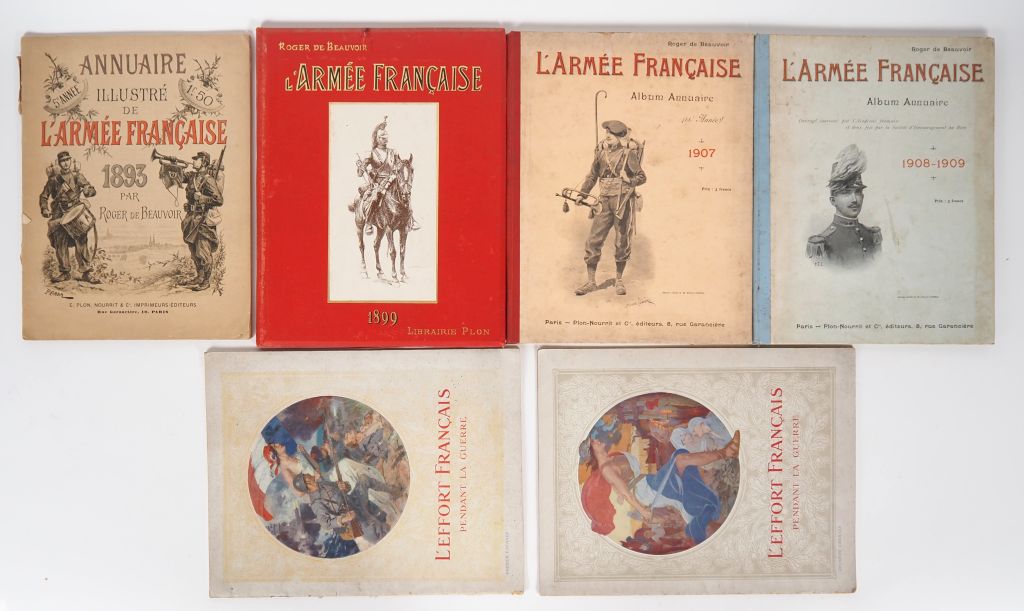 Roger de BEAUVOIR. "Annuaire de l'armée française". Lot de 4 volumes : - 1893. (accidents) - 1899 - 1907 - 1908/1909 On y joint 2 volumes de l'effort français pendant la guerre.