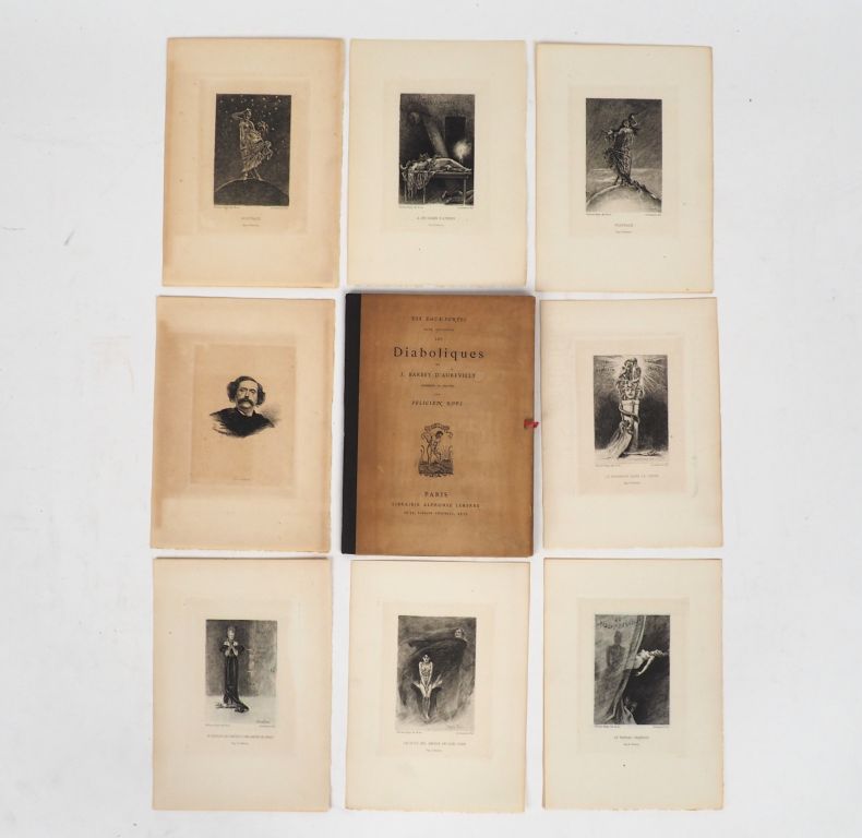 [ROPS]. DIX EAUX-FORTES POUR ILLUSTRER LES DIABOLIQUES DE J. BARBEY D'AUREVILLY par Félicien ROPS. P., Lemerre, [1886]. In-8 en ff. sous chemise imprimée cartonnée à lacets de l’éditeur. ÉDITION ORIGINALE de cette SUITE D’EAUX-FORTES sur vergé constituée d’un PORTRAIT de Barbey d’Aurevilly gravé par Rajon et de 9 GRAVURES par F. ROPS.
