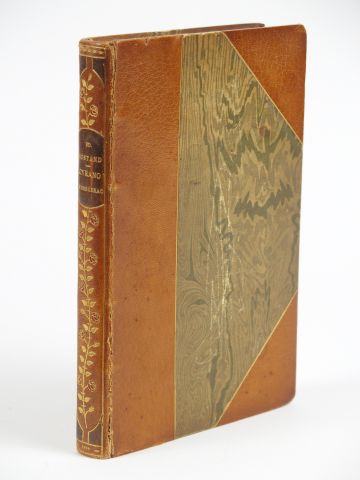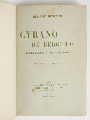 ROSTAND (Edmond). Cyrano de Bergerac. Comédie héroïque en cinq actes, en vers. Paris, Fasquelle 1898. 1/2 maroquin havane à coins, dos lisse orné d'un rameau de fleurs mosaïquées et dorées, tête dor., couv. cons. (Affolter). Bel envoi a.s. : « A ma très chère Juliette, ce Cyrano pour la remercier d'en avoir déjà usé un », daté novembre 1898. Un mors fendu à la reliure.