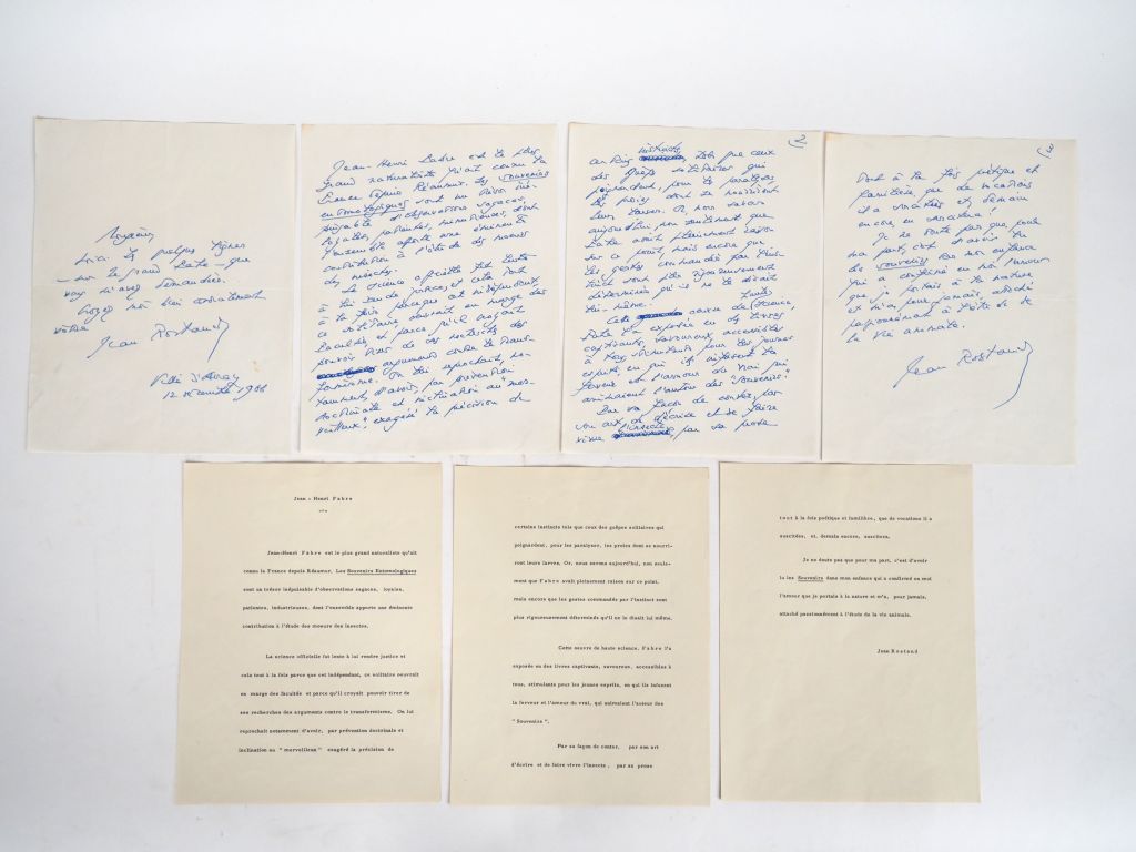 ROSTAND (Jean) (1894-1977). MANUSCRIT AUTOGRAPHE SIGNÉ + MOT AUTOGRAPHE signé. Ville d’Avray, 12 décembre 1966. 3 pages (manuscrit) et 1 page (l.a.s.) sur 4 ff. (21 X 27 cm) + enveloppe timbrée. BEL HOMMAGE DU BIOLOGISTE J. ROSTAND À L’ŒUVRE DE J.-H. FABRE (1823-1915) qu’il a découvert à l’âge de 10 ans et qui sera à l’origine de sa vocation scientifique : « Jean-Henri Fabre est le plus grand naturaliste qu’ait connu la France depuis Réaumur. Les Souvenirs entomologiques sont un rêve inépuisable d’observations sagaces, loyales, patientes, industrieuses, dont l’ensemble apporte une éminente contribution à l’étude des mœurs des insectes. [Etc.] ». JOINT : L.A.S. adressée à Robert TAUSSAT et transcription tapuscrite du manuscrit.