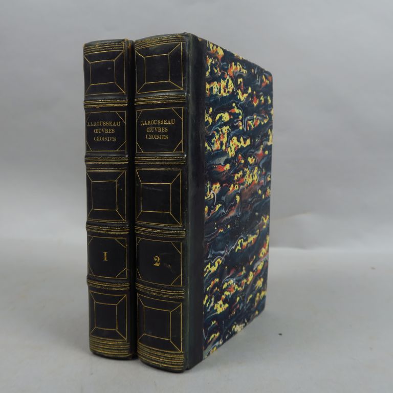 ROUSSEAU (Jean-Jacques). Œuvres choisies. Londres, s.n.e. s.d. 4 tomes en 2 vol. in-16. 1/2 veau ardoise, dos orné de caissons géométriques dor. (Rel. début XIXe s.). Jolie édition imprimée en petits caractères, illustrée de 5 figures h.-t. de Marillier. Elle comprend : – Le devin de village, Pygmalion, La reine fantasque, Discours qui a remporté le prix à l’Académie de Dijon en l’année 1750, Discours sur l’origine et les fondements de l’inégalité parmi les hommes, Discours sur l’économie politique, Lettres écrites de la Montagne, J.-J. Rousseau citoyen de Genève à M. d’Alembert sur son article Genève.