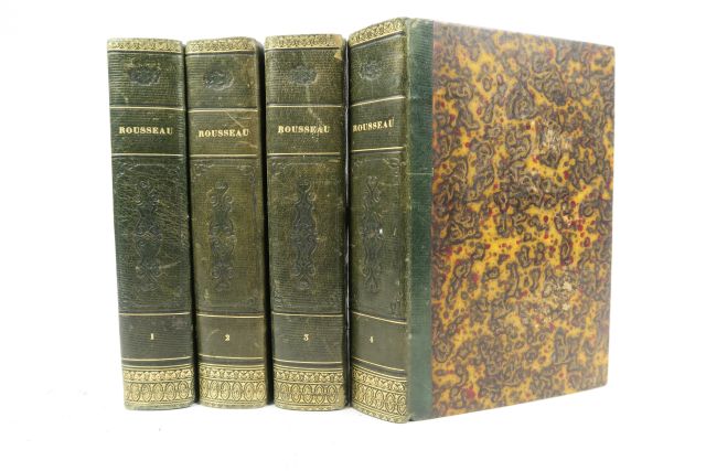 ROUSSEAU (Jean-Jacques). Œuvres complètes, avec des notes historiques. Paris, Furne 1835-1836. 4 vol. gd in-8. 1/2 chèvre verte à long grain, fleur. à froid, fil. et roulettes dor. (Rel. d'époque). Agréable édition ornée d'un portrait, de 24 figures h.-t. sur acier et d'un fac-similé. Texte sur 2 colonnes.