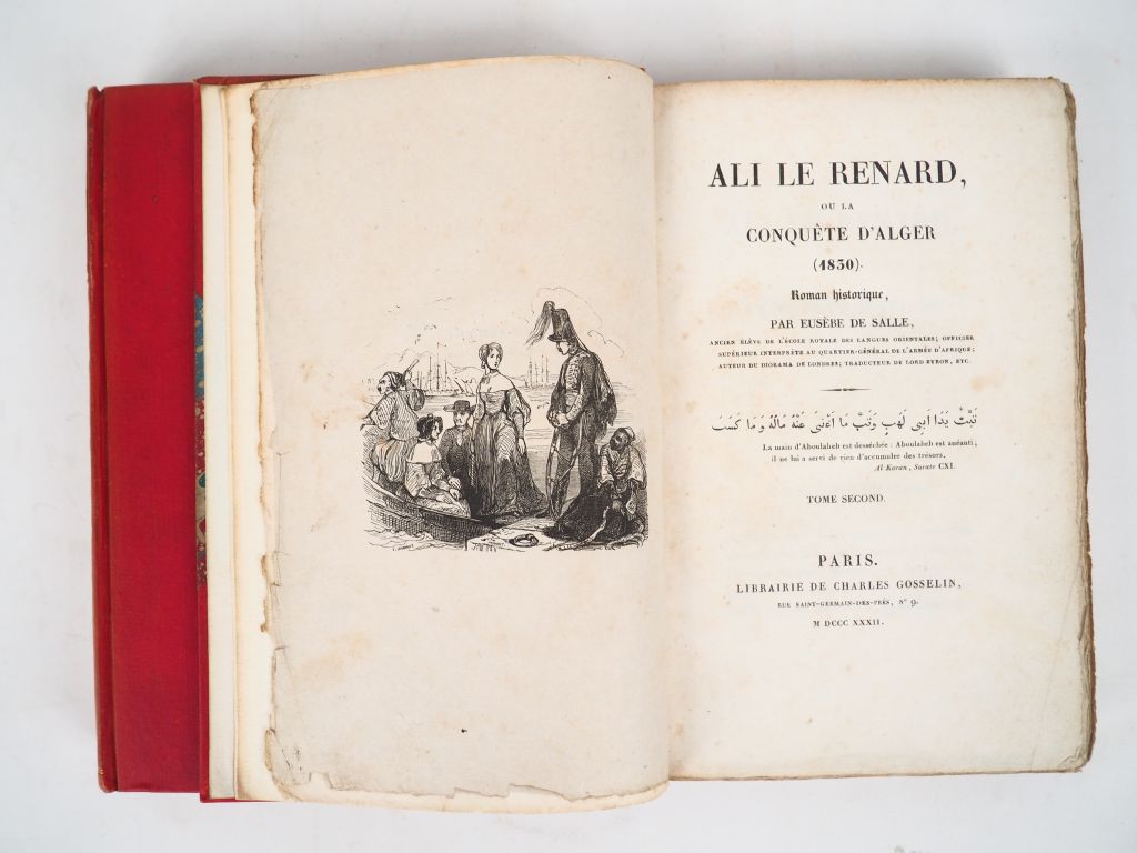 SALLE (Eusèbe de). ALI LE RENARD, ou la conquête d’Alger (1830). Roman historique. P., Gosselin, 1832. Deux tomes Bradel ½ percaline rouge à coins, dos lisse orné d’un fleuron doré, pièce de titre, date dorée en queue (Reliure postérieure). Dos passés, rousseurs, restaurations en marge des faux-titre et frontispice du t. 1. ÉDITION ORIGINALE TRÈS RARE. Elle est ornée d’un FRONTISPICE illustré pour chaque tome. Exemplaire relié sur brochure à la fin du XIXe siècle. ¶ Tailliart, 507 : « Récit de la conquête d’Alger sous la forme d’un roman à clefs : les noms des personnages sont transparents […] ».