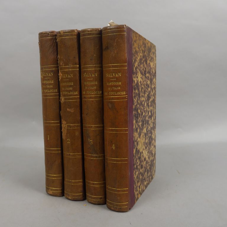 SALVAN (Abbé). Histoire générale de l'Eglise de Toulouse depuis les temps les plus reculés jusqu'à nos jours. Toulouse, Delboy 1856-1861. 4 vol. in-8. 1/2 basane, fil. dor. (Rel. de l'époque). Le plan dépliant a été découpé, sans manque, à la reliure. Le papier est un peu bruni.