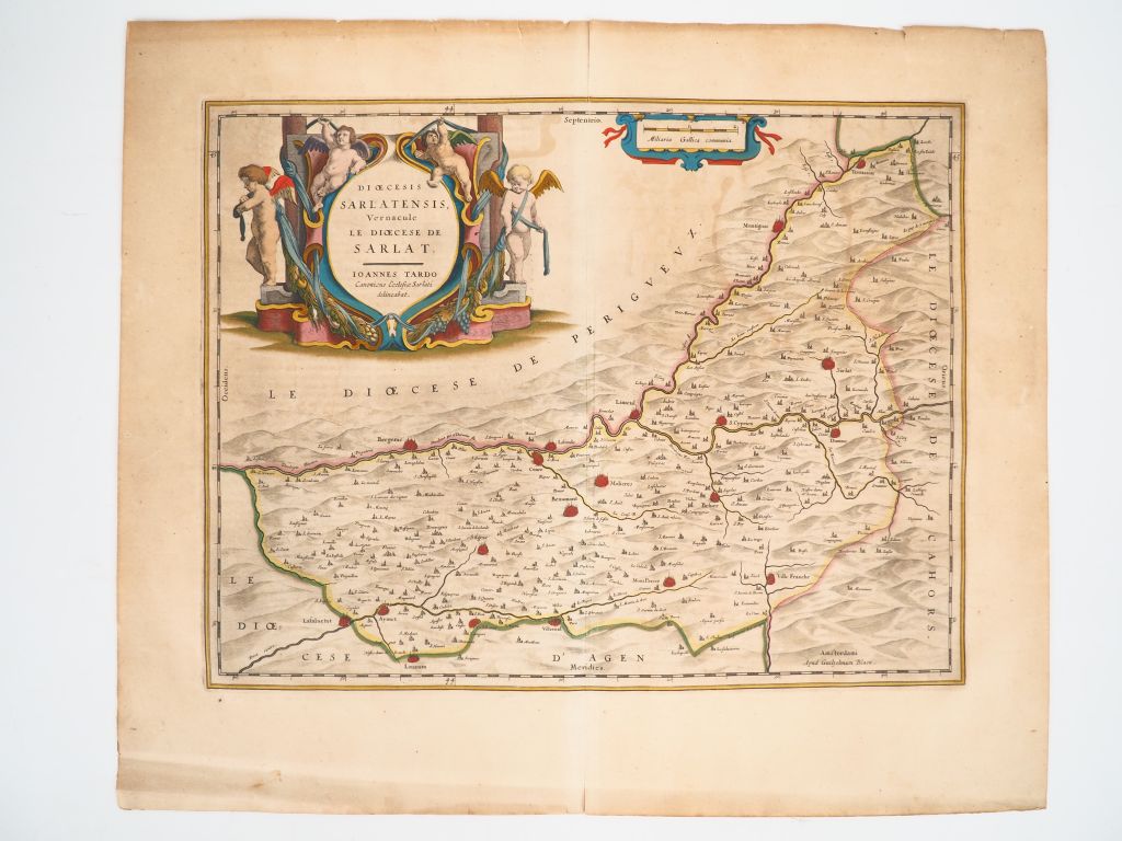 [SARLAT]. TARDE (Jean). DIOECESIS SARLATENSIS, Vernacule. LE DIOCÈSE DE SARLAT. Amsterdam, G. Blaeu, [1635]. Un feuillet vergé (49,5 X 38 cm) contrecollé sous passe carton. CARTE GRAVÉE XVIIe avec rehauts d’aquarelle et grand cartouche entièrement aquarellé.