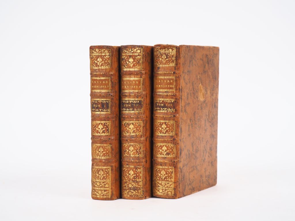 SATYRE MÉNIPPÉE, de la vertu du Catholicon d'Espagne, et de la tenue des États de Paris [etc.]. Ratisbone, Matthias Kerner, 1752. Trois volumes in-8 veau fauve marbré, dos à nerfs orné, pièce de titre maroquin citron, tranches rouges (Reliure de l’époque). Manque la coiffe supérieure du t. 3, début de fente (1 cm) à un mors. ÉDITION ILLUSTRÉE de ce CÉLÈBRE PAMPHLET POLITIQUE DU XVIe siècle : FRONTISPICE au tome I, 3 PORTRAITS h.-t., 2 FIGURES h.-t., 2 PLANCHES dépl. (La Procession de la Ligue et États de la Ligue), une PLANCHE dépliante (Médaille de Catherine de Médicis), une gravure de médailles dans le texte, l’ensemble gravé en taille-douce et d’un BEAU TIRAGE. ¶ Cohen, 939.