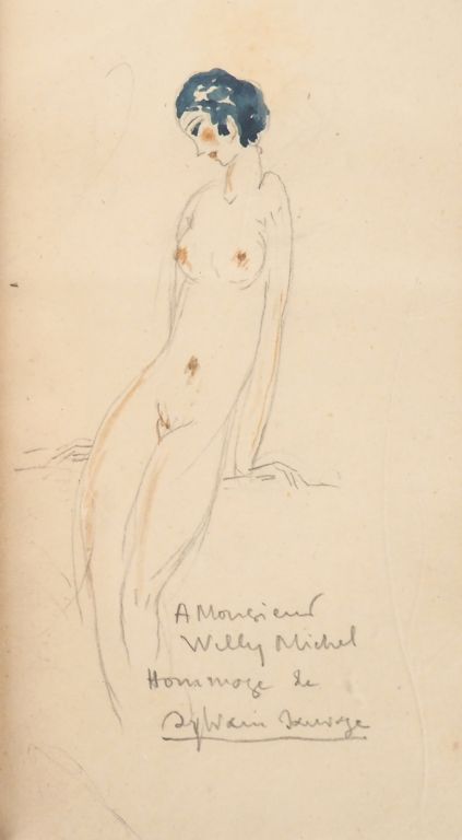[SAUVAGE]. Mme X… REBOUX (P.). TRENTE-DEUX POÈMES D’AMOUR. P., Crès, 1923. In-12 maroquin bleu marine, dos à nerfs, titre doré, date en queue, doublures de soie bleu marine dans un encadrement de filets dorés, coupes et coiffes filetées, tête dorée, couverture conservée, étui bordé (Max Fonsèque). Un article de journal titré Les livres lestes collé sur le 1er f. blanc. ÉDITION ILLUSTRÉE de 36 EAUX-FORTES originales de Sylvain SAUVAGE : 2 vignettes de couverture et titre, 34 dessins dans le texte. Tirage limité à 1000 exemplaires. UN des 785 numérotés sur vélin de Rives. EXEMPLAIRE DE WILLY MICHEL avec un DESSIN ORIGINAL (mine de plomb et aquarelle) de nu féminin à pleine page et un E.A.S. à la mine de plomb : « A Monsieur Willy Michel / Hommage de Sylvain Sauvage ». E.A.S. à pleine page de l’auteur sur la page de faux-titre : « A Willy Michel / l’impondérable Madame X… et le parfois trop pesant Paul Reboux dédient cet exemplaire des [Trente-deux poèmes d’amour] en témoignage d’une sympathie vive et cordiale / Paul Reboux / Mme X n’a pas signé. Elle inspire, mais ne réalise pas. »