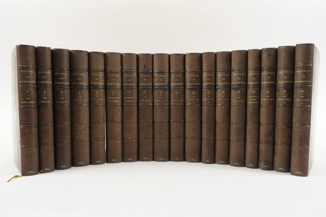 SHAKESPEARE (William). Œuvres complètes. François-Victor HUGO traducteur. Deuxième édition. Paris, Pagnerre 1865-1873. 18 vol. in-8. 1/2 chagr. janséniste havane, tête dor., couv. et dos cons. (Rel. d'époque). Edition illustrée de gravures h.-t. sur acier. Le relieur a repris les titres du classement thématique choisi par Fr.-Victor Hugo : Les Fééries, Les Tyrans, Les Jaloux, Les Amants tragiques, La Famille, La Société...