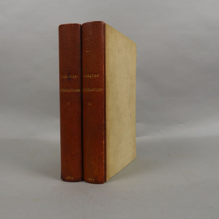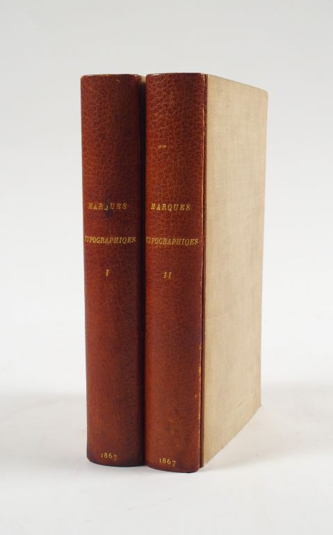 SILVESTRE (L.-C.). Marques typographiques ou Recueil de monogrammes, chiffres, enseignes, emblêmes, devises, rébus et fleurons des libraires et imprimeurs qui ont exercé en France, depuis l'introduction de l'imprimerie en 1470, jusqu'à la fin du seizième siècle. Paris, Impr. Renou et Maulde 1867. 2 vol. in-8. 745 pp.-7-11 ff. Bradel 1/2 maroquin havane, plats toilés (Rel. moderne). Première édition très rare. Un titre de relais à la date de 1867, première et deuxième partie, a été ajouté. L'ouvrage entièrement illustré reproduit plus de 1500 marques typographiques. Quelques rousseurs sans gravité.