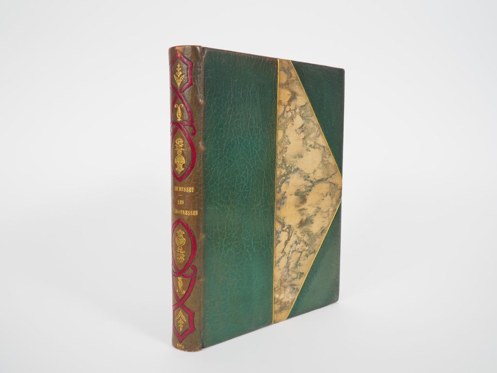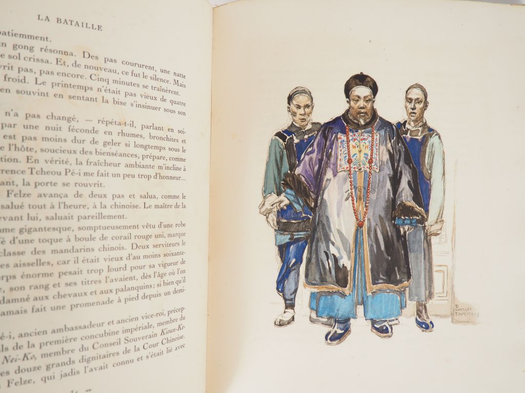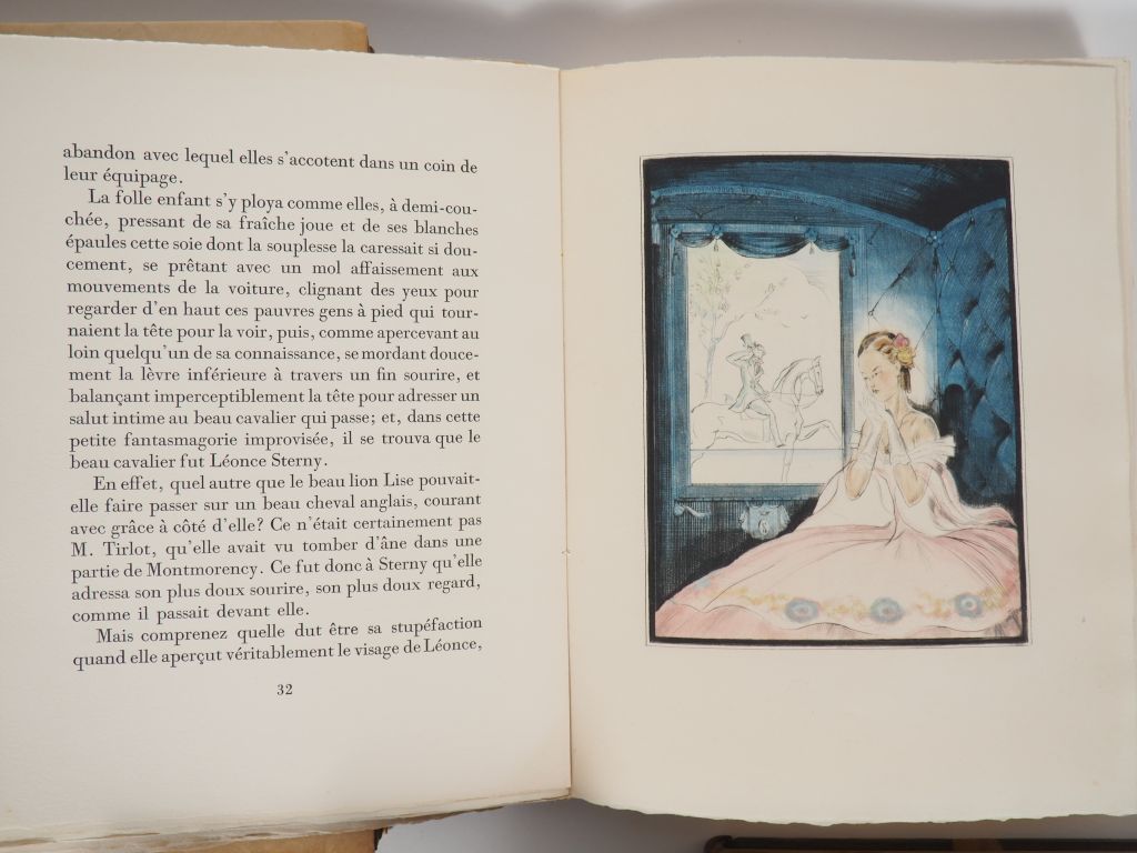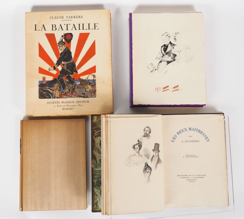 SOULIÉ (Frédéric). LE LION AMOUREUX. Paris, La Tradition, 1937. In-4 broché, couverture papier glacé rose rempliée , 164 pages. Chemise (dos passé) et étui de l'éditeur. ÉDITION ILLUSTRÉE de 20 COMPOSITIONS en couleurs gravées sur cuivre à la pointe sèche par Jean-Adrien MERCIER. Tirage limité à 550 exemplaires. UN des 50 numérotés sur grand vélin d’Arches à la forme comprenant une SUITE tirée en noir avec remarque en bistre – FARRÈRE (Claude). LA BATAILLE. Paris, Blaizot, 1925. Grand in-quarto broché, couverture rempliée illustrée sur le premier plat d'un grand dessin en couleurs. Second plat taché. ÉDITION ILLUSTRÉE de 108 COMPOSITIONS de Charles FOUQUERAY, gravées et mises en couleurs, dont 21 h.-t. ou à pleine page. Tirage unique limité à 350 EXEMPLAIRES numérotés sur Arches – MUSSET (A. de). LES DEUX MAITRESSES. Paris, La Pléiade, 1928. In-4 ½ maroquin vert empire à coins, dos lisse orné d’une mosaïque de listels de maroquin rouge et fers dorés, titre doré, date en queue, tête dorée, couverture conservée (Reliure de l’époque). Teinte du dos uniformément virée en teinte kaki. ÉDITION ILLUSTRÉE de COMPOSITIONS en couleurs de V. CHOUKHAEFF. Tirage limité à 378 EXEMPLAIRES. UN des 330 numérotés sur vélin à la cuve – SAMAIN (Albert). HYALIS. Le Petit faune aux yeux bleus. Paris, Ferroud, 1918. Grand in-8 Bradel de papier bois, pièce de titre, couverture conservée (Reliure de l’époque). Petit manque de papier en tête du dos. ÉDITION ILLUSTRÉE des 58 COMPOSITIONS coloriées au pochoir du peintre iconoclaste d'origine autrichienne Gustav-Adolf MOSSA. Tirage limité à 1020 exemplaires. UN des 800 numérotés sur beau vélin teinté d'Arches. ENSEMBLE DE 4 OUVRAGES.