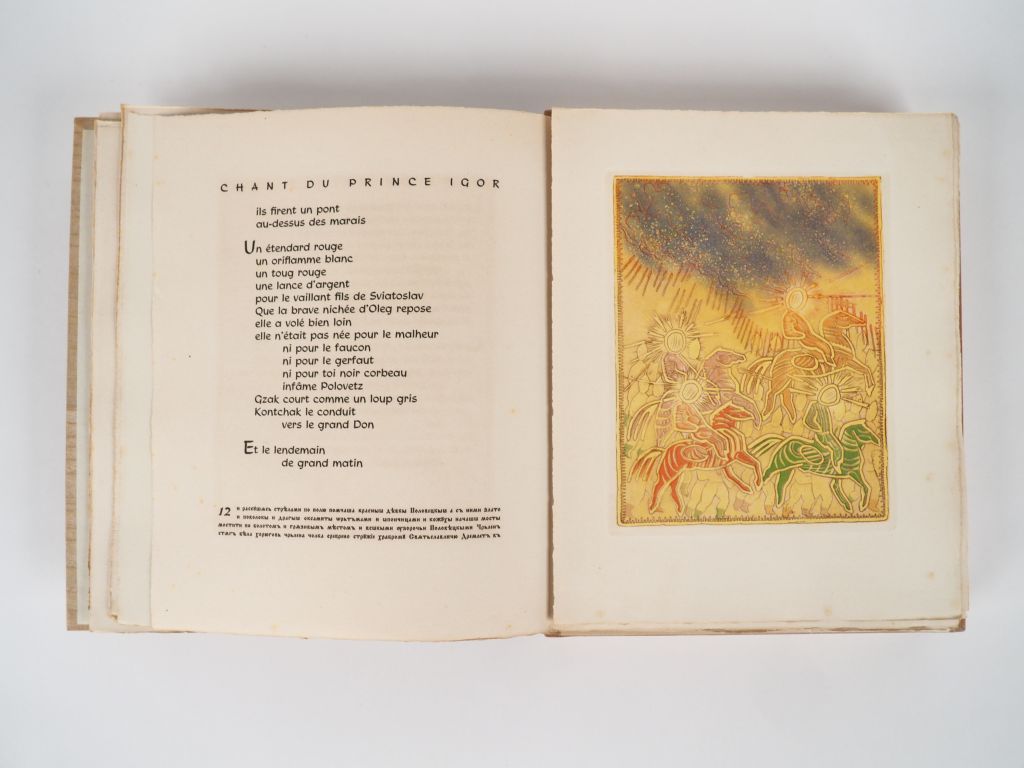 SOUPAULT (P.). CHANT DU PRINCE IGOR. P., Eynard, 1950. Grand in-4 en ff., chemise et étui de l’éditeur. Rousseurs très éparses. ÉDITION ILLUSTRÉE de 17 EAUX-FORTES originales couleurs (frontispice, 6 h.-t. et 10 dans le texte) d’Alexandre ALEXEÏEFF. Tirage limité à 290 exemplaires. UN des 230 numérotés sur vélin d’Arches.