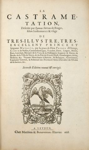 STEVIN (Symon). La Castrametation descrite par Symon Stevin de Bruges, selon l'ordonnance et usage de très illustre, très-excellent prince et Seigneur Maurice, par la grace de Dieu, Prince d'Orange... Seconde édition revue et corrigée. Leyden, Elzevier 1618. in-folio. Vélin (Rel. hollandaise de l'époque). Portrait du Prince d'Orange, frontispice en taille douce (Blason) et figures géométriques sur bois. Relié à la suite dans le même volume : – STEVIN (Symon). Nouvelle. Manière de fortification par escluses. Leyden, Elzevier 1618. Figures sur bois dans le texte dont une dépliante.
