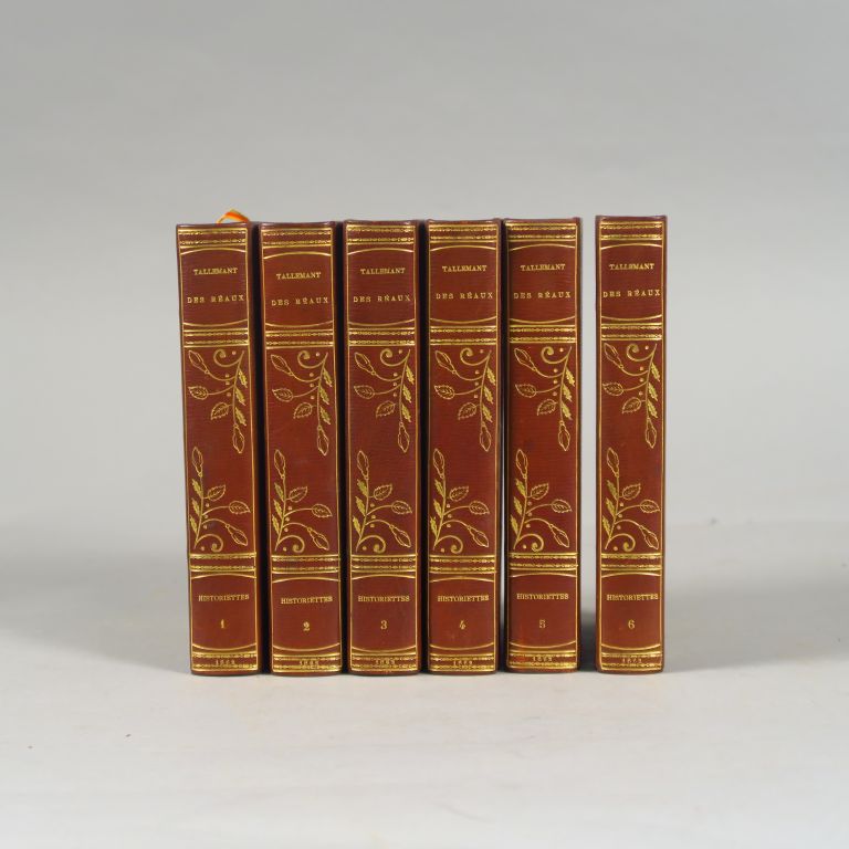 TAILLEMANT DE REAUX. Les Historiettes. Troisième édition entièrement revue sur le manuscrit original et prrécédée d'une notice historique et littéraire inédite sur l'auteur par M. de Monmerqué et Paulin. Paris. Techener 1862. 6 vol. in-12. 1/2 maroquin havane à long grain, dos long compartimenté, orné de 2 compositions de feuillage dorés. Tête dor. couv. et dos Bel exemplaire très joliment relié